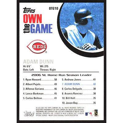 This is a 2007 Topps Own the Game Adam Dunn baseball card. The card is #OTG10 and pictures show condition.
