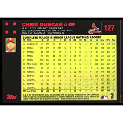 This is a 2007 Topps Red Backs Chris Duncan baseball card. The card is #127 and pictures show condition.