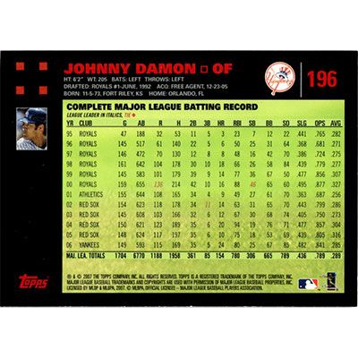 This is a 2007 Topps Red Backs Johnny Damon baseball card. The card is #196 and pictures show condition.