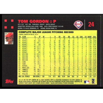 This is a 2007 Topps Red Backs Tom Gordon baseball card. The card is #24 and pictures show condition.