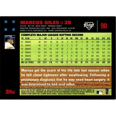 This is a 2007 Topps Red Backs Marcus Giles baseball card. The card is #98 and pictures show condition.