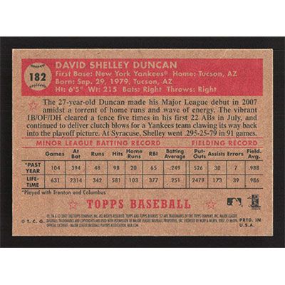This is a 2007 Topps Rookie '52 Shelley Duncan autographed baseball card. This card has been signed, in blue, by Shelley Duncan, and is guaranteed authentic by Ballcardz.com. The card is #182 and pictures show condition.
