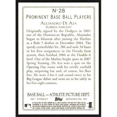 This is a 2007 Topps Turkey Red Alejandro De Aza baseball card. The card is #28 and pictures show condition. Team(s): Florida Marlins Rookie Card (RC)