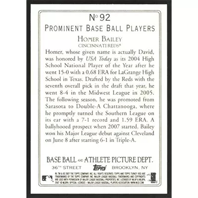 This is a 2007 Topps Turkey Red Homer Bailey baseball card. The card is #92 and pictures show condition.