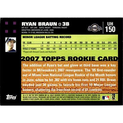 This is a 2007 Topps Update Ryan Braun baseball card. The card is #UH150 and pictures show condition.