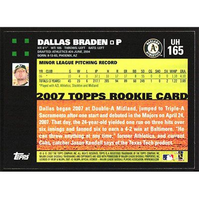 This is a 2007 Topps Update Dallas Braden baseball card. The card is #UH165 and pictures show condition.