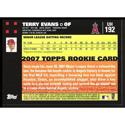 This is a 2007 Topps Update Terry Evans baseball card. The card is #UH192 and pictures show condition.