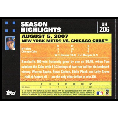 This is a 2007 Topps Update Tom Glavine Season Highlights baseball card. The card is #UH206 and pictures show condition.