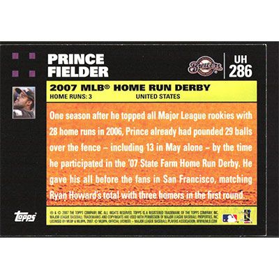 This is a 2007 Topps Update Prince Fielder Home Run Derby baseball card. The card is #UH286 and pictures show condition.
