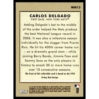 This is a 2007 Topps Wal-Mart Carlos Delgado 1910 Turkey Red baseball card. The card is #WM13 and pictures show condition.