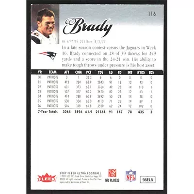 This is a 2007 Ultra Tom Brady football card. The card is #116 and pictures show condition.