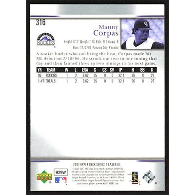 This is a 2007 Upper Deck Manny Corpas baseball card. The card is #316 and pictures show condition.