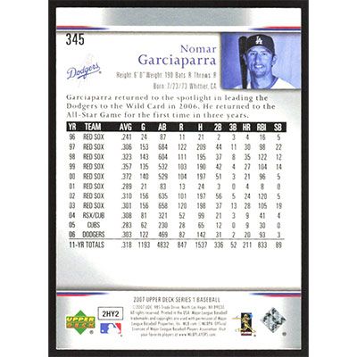 This is a 2007 Upper Deck Nomar Garciaparra baseball card. The card is #345 and pictures show condition.