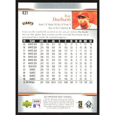 This is a 2007 Upper Deck Ray Durham baseball card. The card is #431 and pictures show condition.