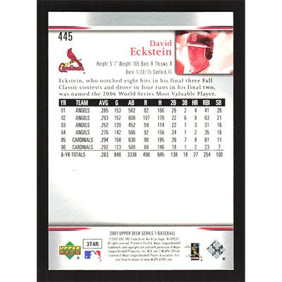This is a 2007 Upper Deck David Eckstein baseball card. The card is #445 and pictures show condition.