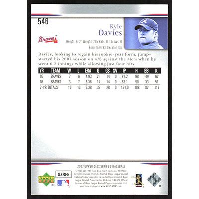 This is a 2007 Upper Deck Kyle Davies baseball card. The card is #546 and pictures show condition.