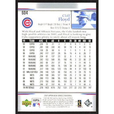 This is a 2007 Upper Deck Cliff Floyd baseball card. The card is #604 and pictures show condition.