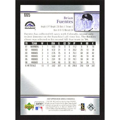 This is a 2007 Upper Deck Brian Fuentes baseball card. The card is #665 and pictures show condition.