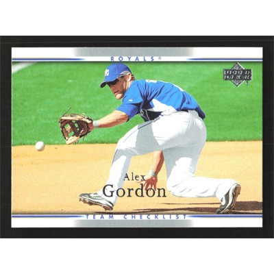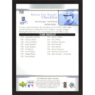 This is a 2007 Upper Deck Alex Gordon Team Checklist baseball card. The card is #750 and pictures show condition.