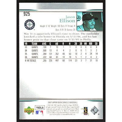 This is a 2007 Upper Deck Jason Ellison baseball card. The card is #925 and pictures show condition.