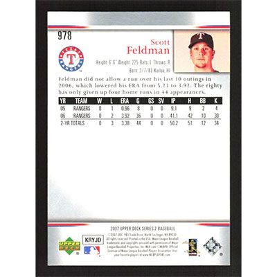 This is a 2007 Upper Deck Scott Feldman baseball card. The card is #978 and pictures show condition.