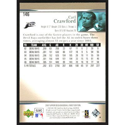 This is a 2007 Upper Deck First Edition Carl Crawford baseball card. The card is #.5 and pictures show condition.