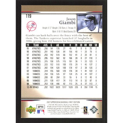 This is a 2007 Upper Deck First Edition Jason Giambi baseball card. The card is #119 and pictures show condition.