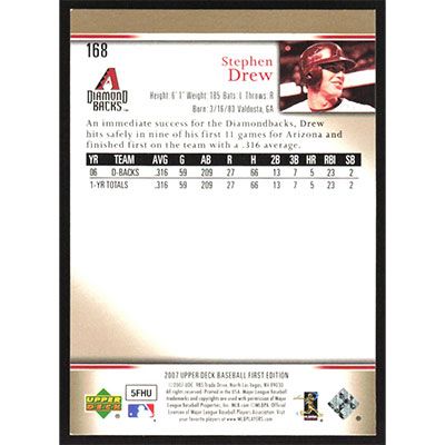 This is a 2007 Upper Deck First Edition Stephen Drew baseball card. The card is #168 and pictures show condition.