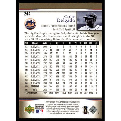 This is a 2007 Upper Deck First Edition Carlos Delgado baseball card. The card is #244 and pictures show condition.