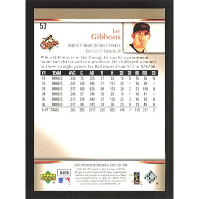 This is a 2007 Upper Deck First Edition Jay Gibbons baseball card. The card is #53 and pictures show condition.