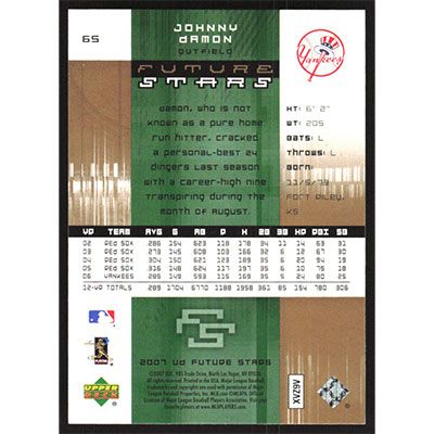 This is a 2007 Upper Deck Future Stars Johnny Damon baseball card. The card is #65 and pictures show condition.