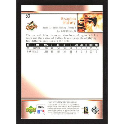 This is a 2007 Upper Deck Gold Brandon Fahey baseball card. The card is #53 and pictures show condition. This card is limited; #'d 32/75. Team(s): Baltimore Orioles