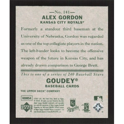 This is a 2007 Upper Deck Goudey Alex Gordon baseball card. The card is #141 and pictures show condition.