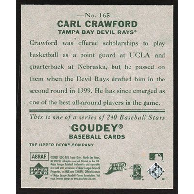 This is a 2007 Upper Deck Goudey Carl Crawford baseball card. The card is #165 and pictures show condition.