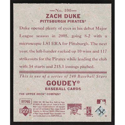 This is a 2007 Upper Deck Goudey Red Backs Zach Duke baseball card. The card is #100 and pictures show condition.