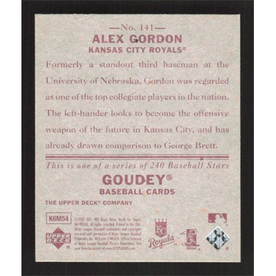 This is a 2007 Upper Deck Goudey Red Backs Alex Gordon baseball card. The card is #141 and pictures show condition.