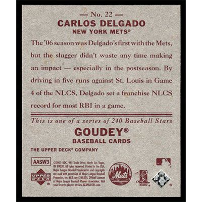 This is a 2007 Upper Deck Goudey Red Backs Carlos Delgado baseball card. The card is #22 and pictures show condition.
