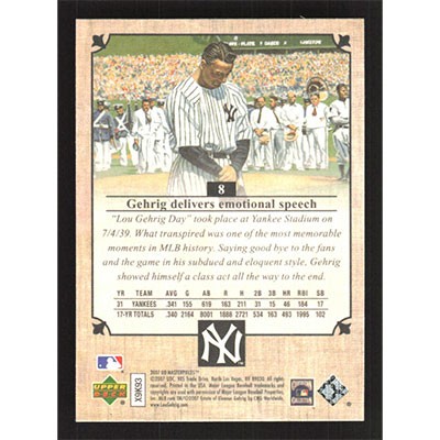 This is a 2007 Upper Deck Masterpieces Lou Gehrig baseball card. The card is #8 and pictures show condition.