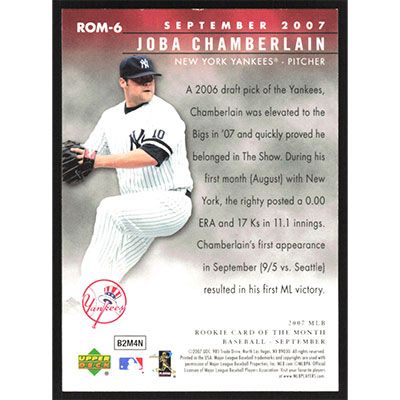 This is a 2007 Upper Deck MLB Rookie Card of the Month Joba Chamberlain baseball card. The card is #ROM-6 and pictures show condition. Team(s): New York Yankees Rookie Card (RC)