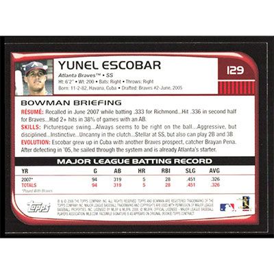 This is a 2008 Bowman Yunel Escobar baseball card. The card is #129 and pictures show condition.