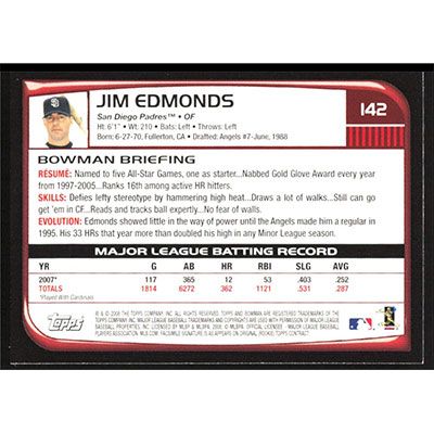 This is a 2008 Bowman Jim Edmonds baseball card. The card is #142 and pictures show condition.