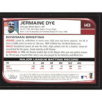 This is a 2008 Bowman Jermaine Dye baseball card. The card is #143 and pictures show condition.
