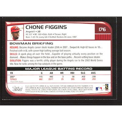 This is a 2008 Bowman Chone Figgins baseball card. The card is #176 and pictures show condition.