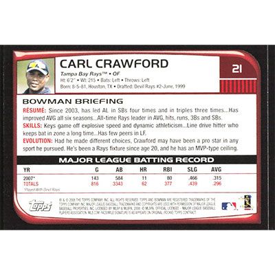 This is a 2008 Bowman Carl Crawford baseball card. The card is #21 and pictures show condition.