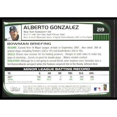 This is a 2008 Bowman Alberto Gonzalez baseball card. The card is #219 and pictures show condition.