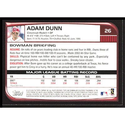 This is a 2008 Bowman Adam Dunn baseball card. The card is #26 and pictures show condition.