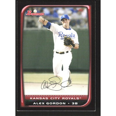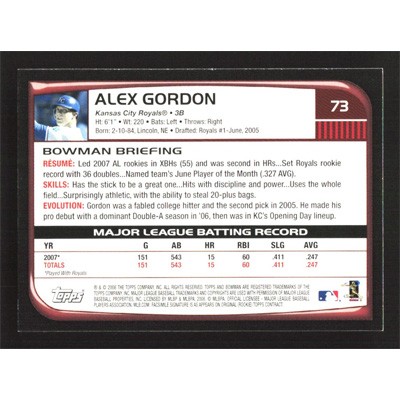 This is a 2008 Bowman Alex Gordon baseball card. The card is #73 and pictures show condition.