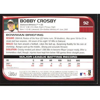 This is a 2008 Bowman Bobby Crosby baseball card. The card is #92 and pictures show condition.