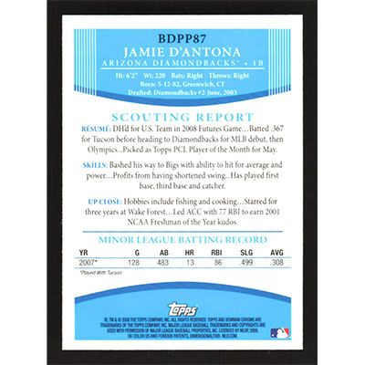 This is a 2008 Bowman Chrome Draft Prospects Jamie D'Antona baseball card. The card is #BDPP87 and pictures show condition. Team(s): Arizona Diamondbacks