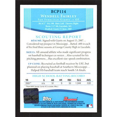 This is a 2008 Bowman Chrome Prospects Wendell Fairley autographed baseball card. This card has been signed, in blue, by Wendell Fairley, and is certified authentic by Topps. The card is #BCP114 and pictures show condition.